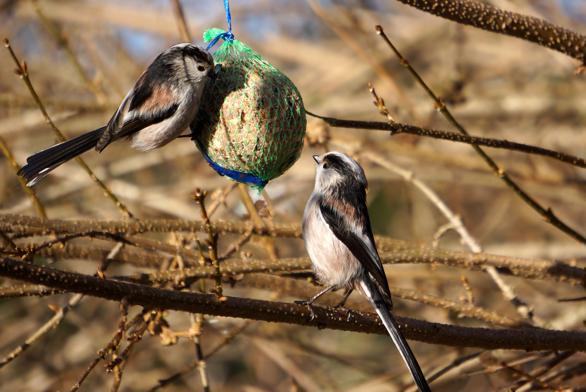 Nelle reti in plastica delle palline per cince gli uccelli possono rimanere impigliati con le zampe e ferirsi. Inoltre spesso le reti vuote finiscono nei dintorni come rifiuti. Per le palline fatte in casa o acquistate senza rete esistono appositi supporti a griglia che consentono agli uccellini di arrivare bene al cibo e impediscono agli uccelli grandi come gazze o cornacchie di portarsi via tutta la pallina. Una simpatica alternativa dagli utensili della cucina: appendete una vecchia frusta in cui avete inserito una o più palline.