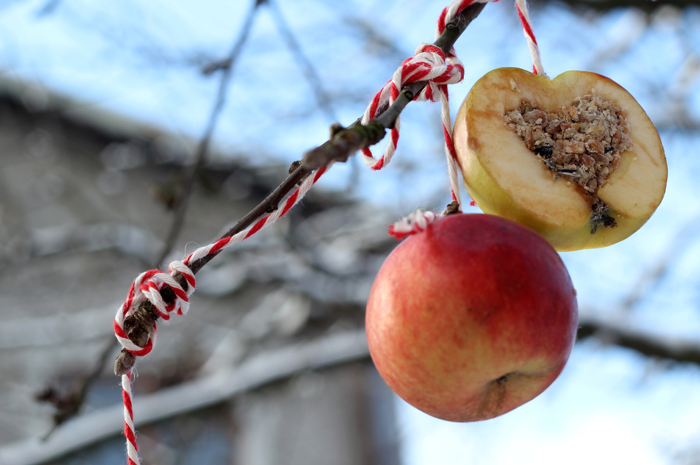 Arachidi nel guscio, uvetta e pezzetti di mela si possono infilare su di uno spago e appenderli come una graziosa ghirlanda. Utilizzate una corda di cotone o di canapa e un grosso ago da rammendo. Potete anche usare un sottile filo metallico che piegate a forma di corona, cuore o altro. Con un fora-castagne si possono forare facilmente anche le arachidi. Potete appendere in giardino anche mele intere, meglio ancora se hanno già qualche punto ammaccato.