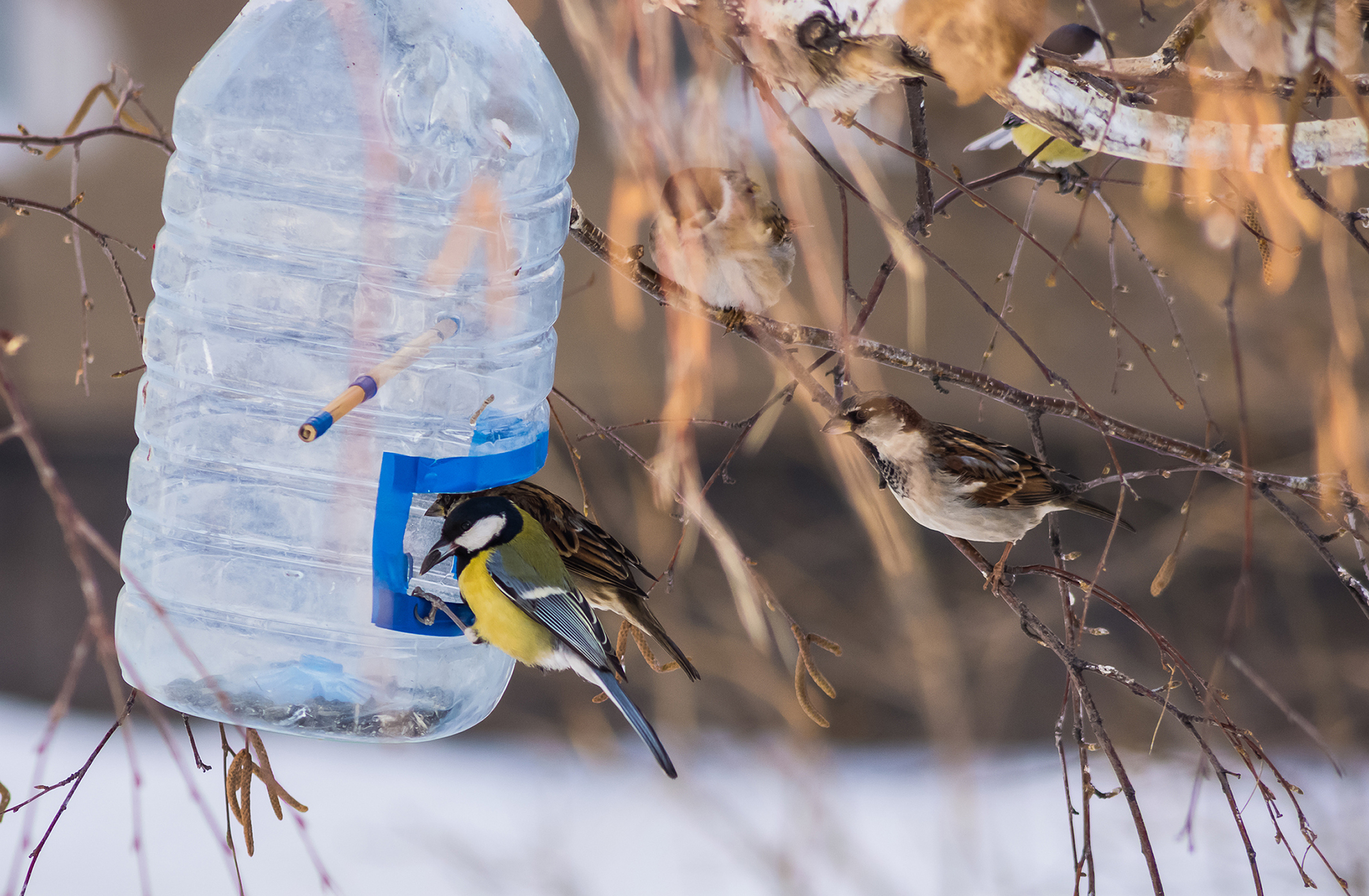 I dispenser o silo di mangime sono molto igienici perché gli uccelli non si posano sulle granaglie. Queste mangiatoie rimpiazzano costantemente la quantità di cibo mangiata dagli uccelli. I dispenser possono essere realizzati anche con materiali riciclati. Ad esempio per i bambini è semplice costruirli utilizzando i cartoni delle bevande e poi dipingerli. Ma potete anche usare bottiglie in plastica di acqua o ketchup. Se preferite qualcosa di più elegante, ben si prestano anche le bottiglie di vino o in vetro.