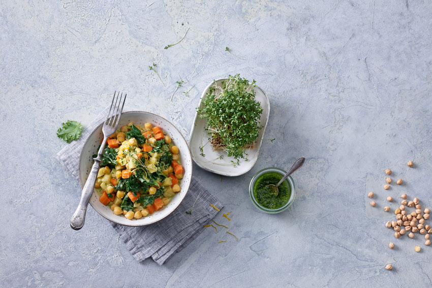 Ceci con verdure invernali e pesto di crescione e limone